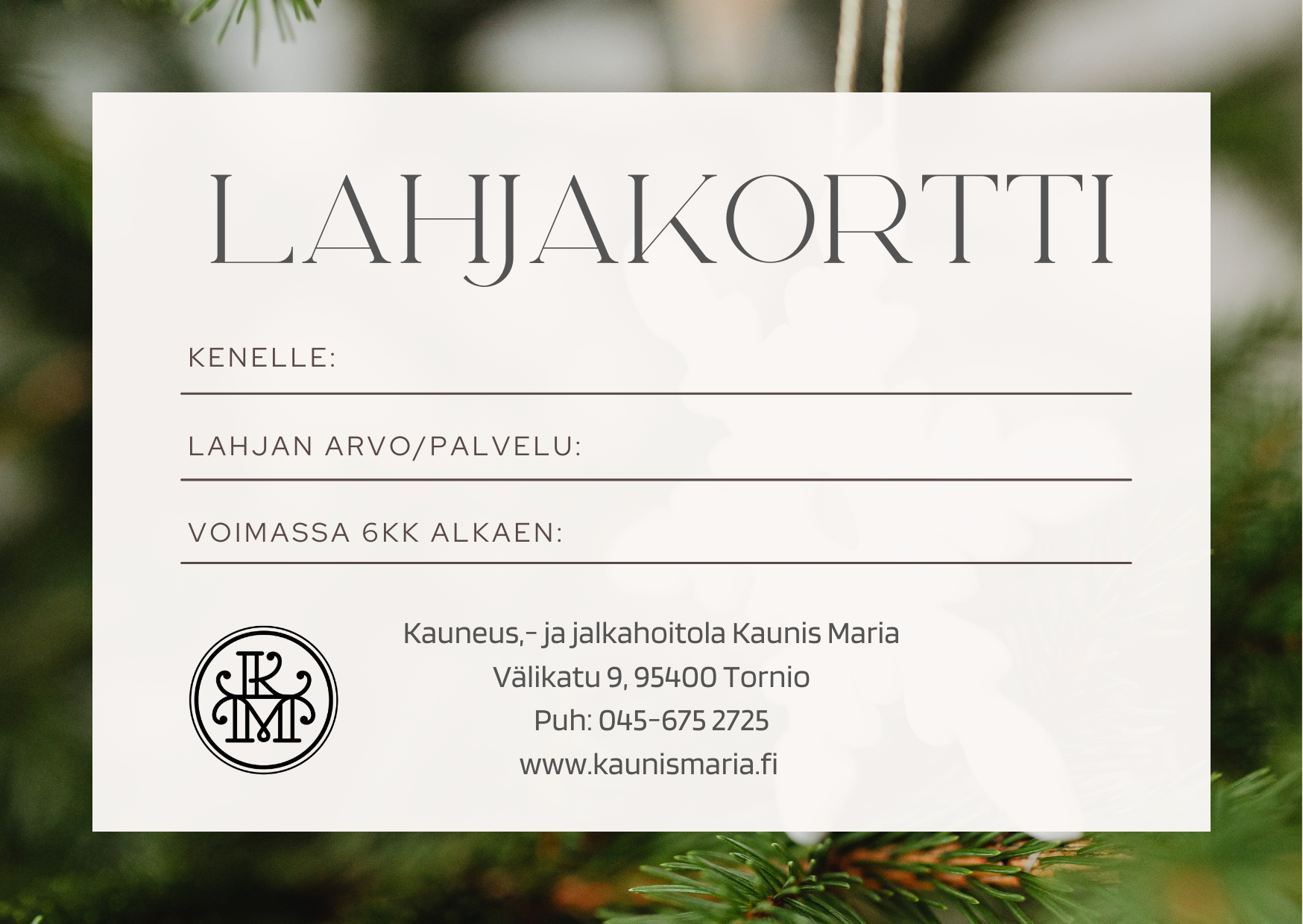 - Voit ostaa lahjakortin suoraa hoitolasta. Liike avoinna sopimuksen mukaan. Laita viestiä numeroon 045-6752 725 tai sähköpostia info@kaunismaria.fi , niin sovitaan lahjakortille hakuaika.